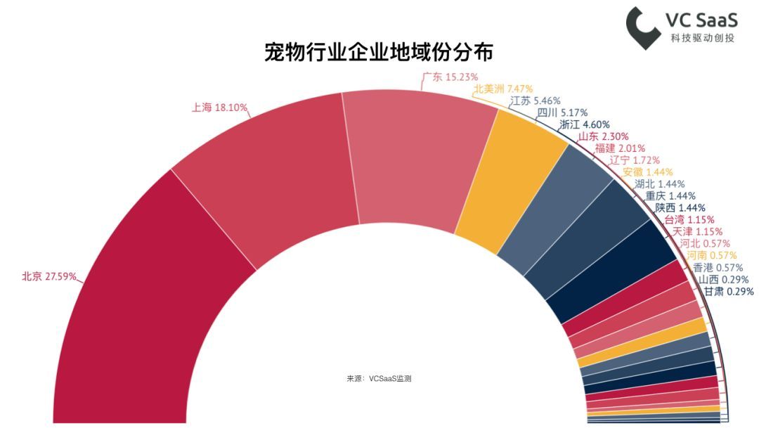 根據(jù)VC SaaS監(jiān)測的389家企業(yè)來看,北京、上海、廣東的寵物行業(yè)企業(yè)數(shù)量都已經(jīng)超過了北美洲的企業(yè)數(shù)量,可見寵物行業(yè)企業(yè)保有量已經(jīng)到了一個(gè)逐漸飽和的地步。