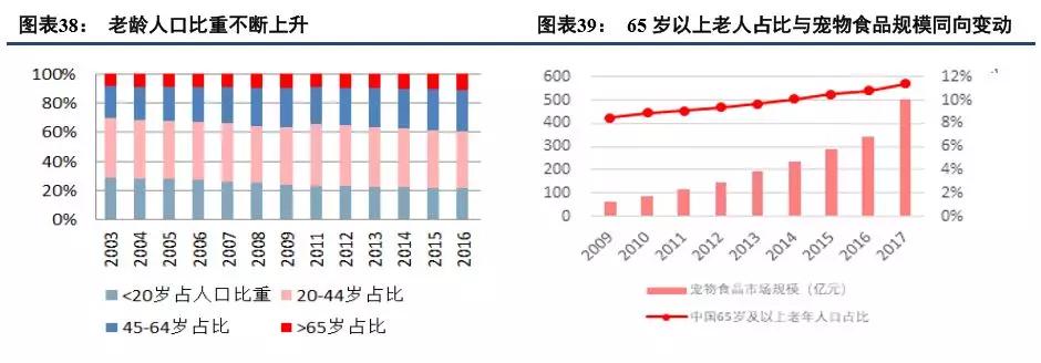 人口老齡化帶升“銀發(fā)族”養(yǎng)寵需求。截至到2017年年底,中國65歲及以上老年人口占總人口比重為11.4%,根據(jù)GfK中國數(shù)據(jù),中國65歲以上的老人中約61%擁有寵物,比重較大。未來隨著育兒成本的上升、家庭觀念的改變、醫(yī)療水平的提升等,老年人口比重將會進一步增加,空巢老人數(shù)量也會上漲,這將直接刺激人對寵物陪伴需要,增加寵物數(shù)量,提升寵物食品市場規(guī)模。