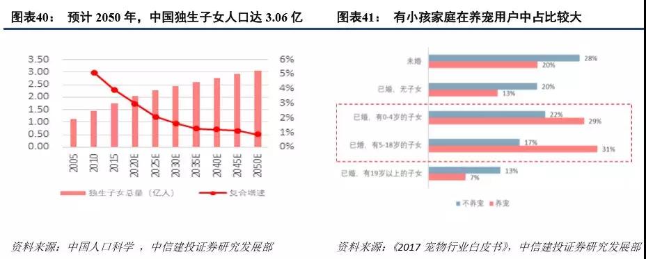 獨生子女數(shù)量增多,寵物成孩子“伙伴”。與不養(yǎng)寵物的家庭用戶比,養(yǎng)寵物的人群中已婚有小孩的家庭占比更高,在當今環(huán)境下,寵物開始扮演孩子的“伙伴”的角色。2015年中國獨生子女人口數(shù)量為1.76億人,從2010年到2015年的年均復合增速為3.95%,預計到2050年獨生子女人數(shù)達到3.06億人,中國獨生子女人口增長相應帶來寵物的“伙伴”需求,在養(yǎng)寵用戶中,有小孩的家庭的占比較高。
