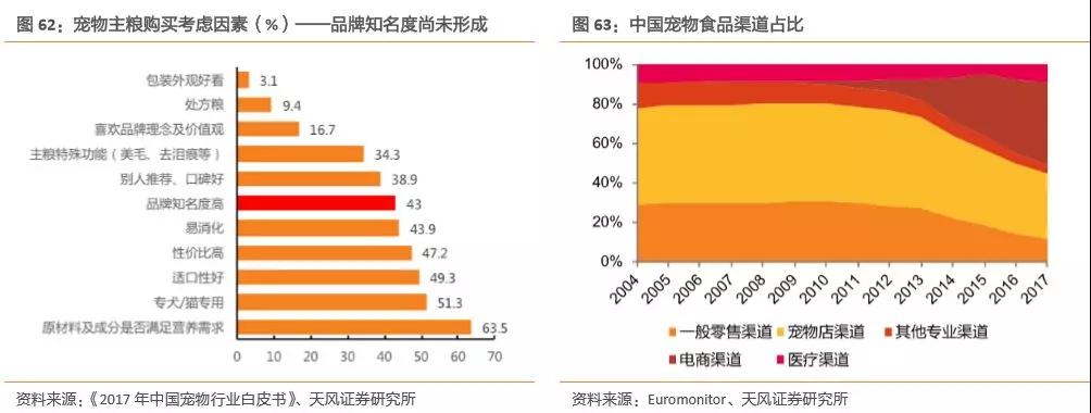 瑪氏、雀巢等進(jìn)入中國(guó)市場(chǎng)時(shí)間較早,在商超渠道中占據(jù)優(yōu)勢(shì)。伴隨著我國(guó)電商的迅猛發(fā)展,近幾年電商渠道一躍成為我國(guó)寵物食品銷售的最主要渠道,2017年電商渠道占比42.2%,相比之下專業(yè)渠道下降到37.6%,一般零售渠道下降到11.5%?;ヂ?lián)網(wǎng)電商的迅速發(fā)展給國(guó)產(chǎn)寵物食品品牌以崛起機(jī)會(huì),中國(guó)網(wǎng)購(gòu)消費(fèi)者群體龐大,大多寵物主也習(xí)慣在網(wǎng)上進(jìn)行產(chǎn)品購(gòu)買。互聯(lián)網(wǎng)提供了更豐富的品牌營(yíng)銷方式。在寵物消費(fèi)較為小眾、受眾較為明確單一的階段,國(guó)產(chǎn)品牌有望通過(guò)電商渠道實(shí)現(xiàn)彎道超車。