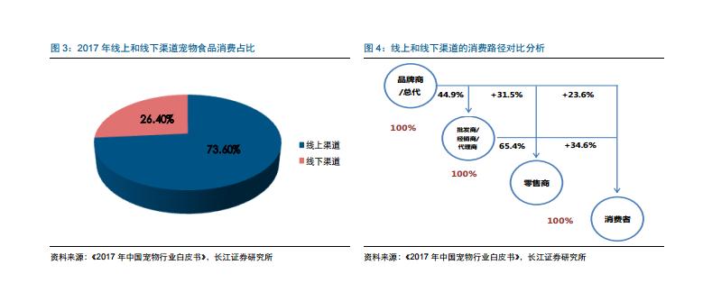 從消費(fèi)者購買意向來看,2015年有74%的消費(fèi)者傾向于在淘寶等電商平臺(tái)購買寵物食品,2017 年傾向淘寶等電商平臺(tái)購買寵物食品的消費(fèi)者比重達(dá)到 83.9%,可以看出至少 7 成以上的消費(fèi)者對(duì)于線上渠道更加青 睞。從消費(fèi)占比來看,2017 年線上渠道的銷售占比達(dá)到 73.6%,大幅領(lǐng)先于線下渠道。 從渠道消費(fèi)路徑的對(duì)比來看,線下渠道相對(duì)單一,經(jīng)銷商和零售商在渠道中話語權(quán)相對(duì) 較高,而線上渠道可以跨越層級(jí),直接面對(duì)終端消費(fèi)者,因此對(duì)于新產(chǎn)品的放量具有重 要作用。長江證券認(rèn)為,線上渠道是目前中國寵物食品行業(yè)最為重要的消費(fèi)渠道,隨著 80、 90 后群體消費(fèi)能力的提升,在未來 10~20 年,線上渠道仍將扮演重要角色。