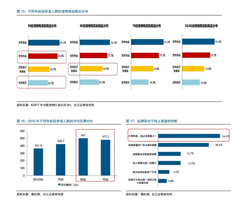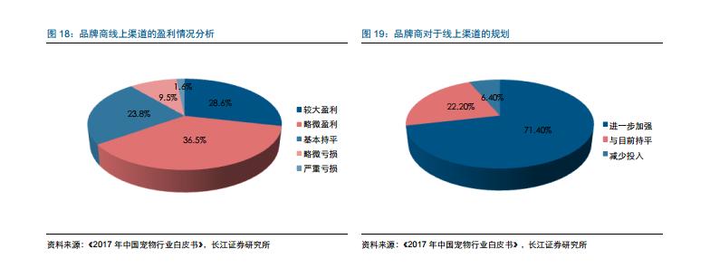 從不同年齡段養(yǎng)寵人群的寵物商品購買分布來看,各年齡段購買最 多的都是寵物食品,對(duì)比來看,80 后更重視寵物的醫(yī)療和保健,而 90 后在寵物用品和 寵物服務(wù)上則傾向投入更多?,F(xiàn)階段,80 后是寵物支出最多的消費(fèi)群體,80 后每月的 寵物支出比 70 后多 80 元左右,綜合來看,每年將多花費(fèi) 1000 元左右,我們認(rèn)為,一 方面 80 后的收入水平快速提升,另一方面他們的養(yǎng)寵觀念也相對(duì)領(lǐng)先。隨著 90 后年齡 的增長以及收入的增加,他們將是寵物消費(fèi)的潛力增長點(diǎn)。主要品牌商也一致看好寵物 食品行業(yè)線上渠道未來的發(fā)展,34.9%的品牌商認(rèn)為線上渠道是大勢所趨,也是必選的 消費(fèi)渠道之一。從品牌商的盈利水平來看,2017 年 65%的品牌商在線上渠道實(shí)現(xiàn)了盈 利,而線上虧損的品牌商占比只有 11%左右。對(duì)于線上渠道的長期布局,超過 70%的 品牌商將進(jìn)一步加大在線上渠道的投入,從而進(jìn)一步提升自己的品牌知名度。