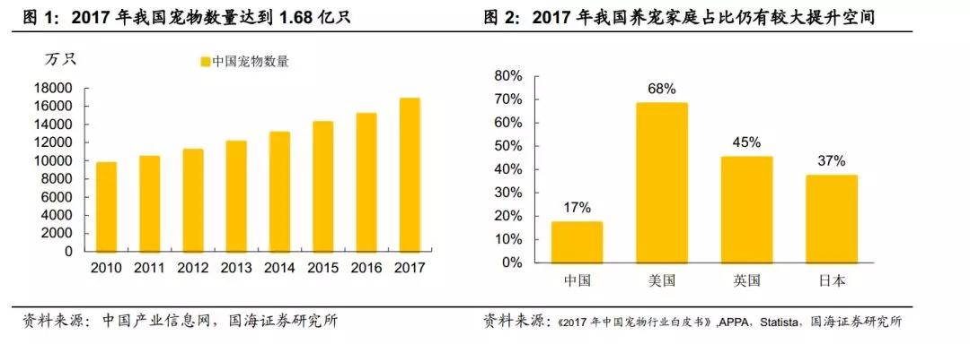 2017 年我國寵物數(shù)量由 2010 年的 9691 萬只大幅增加至 1.68 億只。養(yǎng)寵家庭占比也達(dá)到 17%,但相較美國 68%家庭飼養(yǎng)寵物,仍有較大提升空間。