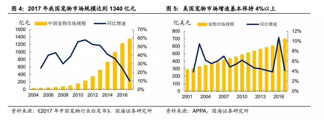 寵物市場規(guī)模超千億, 本土企業(yè)走上舞臺(tái)。2017 年,中國寵物市場規(guī)模為 1340億元, 過去十年 CAGR(復(fù)合年均增長率) 達(dá)到 38.94%;同期美國寵物市場規(guī)模為 695.1 億美元,約為中國市場的 3.5 倍。盡管美國寵物行業(yè)早已進(jìn)入成熟期,并且近年來也遭遇過金融危機(jī)等不利因素沖擊,但 2001 年以來其每年增速基本均在 4%以上。