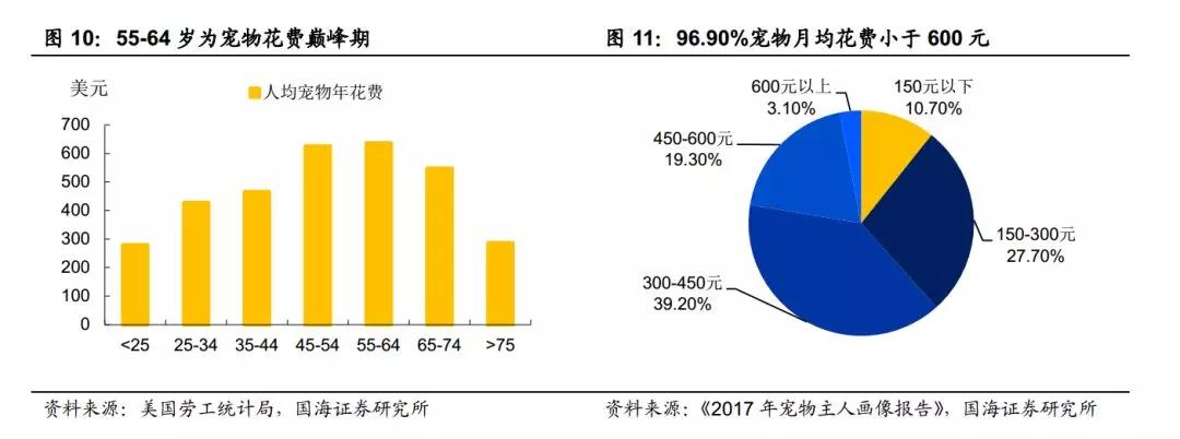 寵物產(chǎn)品具有明顯的高檔品特征,當(dāng)收入增長時(shí),在寵物上的支出會(huì)明顯增加。 根據(jù)美國勞工統(tǒng)計(jì)局?jǐn)?shù)據(jù)顯示, 65 歲前,人均寵物花費(fèi)都會(huì)隨年齡增長而增加,直至退休后,平均支出才會(huì)出現(xiàn)明顯下降。