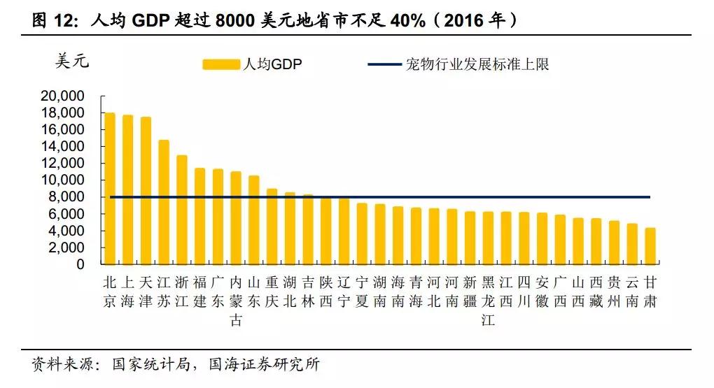 多數(shù)省份寵物市場尚未啟動(dòng),行業(yè)增長潛力依然巨大。 佩蒂股份招股說明書中提到,當(dāng)國家人均 GDP 在 3,000-8,000 美元時(shí),寵物行業(yè)開始快速增長。 盡管2016 年我國人均 GDP 已達(dá)到 53817 元(約合 8100 美元), 已經(jīng)突破了行業(yè)快速增長標(biāo)準(zhǔn)上限。