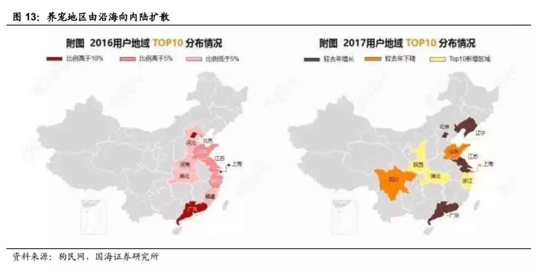 根據(jù)狗民網(wǎng)數(shù)據(jù)顯示,2016 年我國養(yǎng)寵人士主要集中在經(jīng)濟(jì)發(fā)達(dá)的沿海地區(qū);而到了 2017 年, 地處內(nèi)陸的四川、陜西也已經(jīng)成為了前 10 大寵物分布地區(qū),寵物市場由沿海向內(nèi)陸擴(kuò)散的趨勢(shì)十分明顯。我們認(rèn)為隨著國內(nèi)經(jīng)濟(jì)的持續(xù)發(fā)展,相對(duì)落后的內(nèi)陸省市寵物市場有望陸續(xù)進(jìn)入爆發(fā)期。越來越多增量區(qū)域的出現(xiàn)或許將是未來中國寵物市場發(fā)展的重要推動(dòng)力。