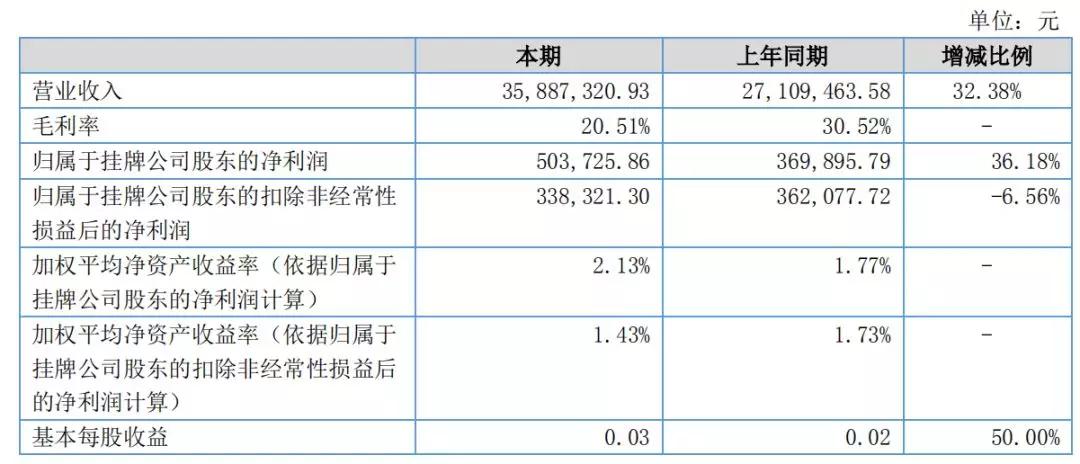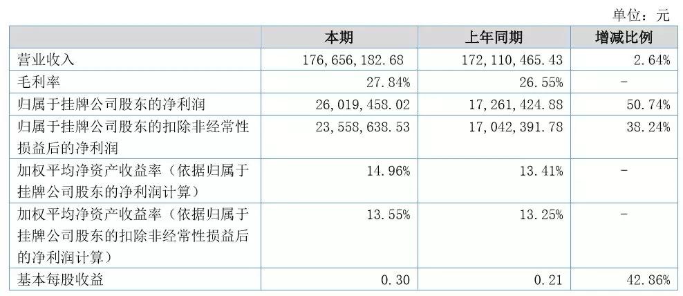 路斯方面表示,公司今年上半年實現(xiàn)營業(yè)收入176656182.68元,較上年同期增加4545717.25元,增長比率為2.64%;歸屬于掛牌公司股東的凈利潤為26019458.02元,較上年同期增加8758033.14元,增長比率為50.74%。