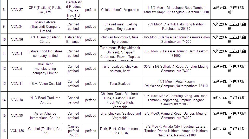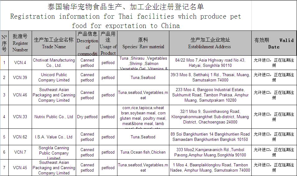 泰國輸華寵物食品生產(chǎn)、加工企業(yè)注冊登記名單
