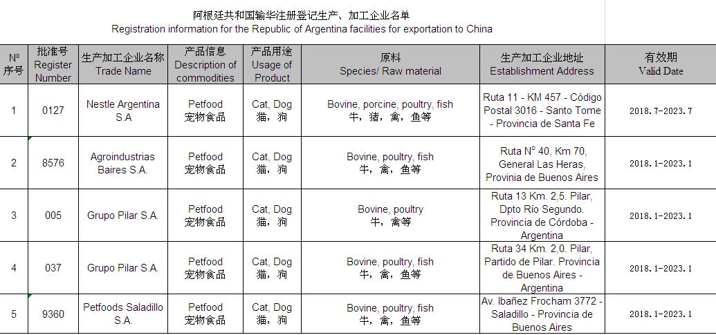阿根廷共和國輸華注冊登記生產(chǎn)、加工企業(yè)名單