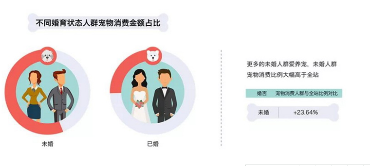 隨著城鎮(zhèn)化進(jìn)程推進(jìn)帶來(lái)的人口結(jié)構(gòu)的巨大變革,空巢青年和晚婚晚育人群逐年增多,養(yǎng)寵情感需求逐步上升。加之消費(fèi)升級(jí)驅(qū)動(dòng),未婚人群對(duì)寵物消費(fèi)更多。