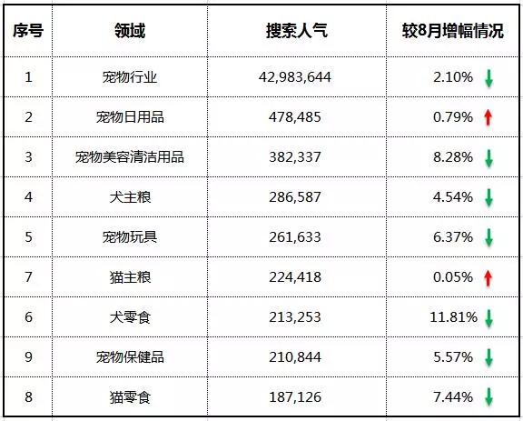較8月相比,9月僅有寵物日用品和貓主糧兩個(gè)細(xì)分領(lǐng)域的訪客量有微幅上升,其他細(xì)分領(lǐng)域訪客量均呈下降趨勢。