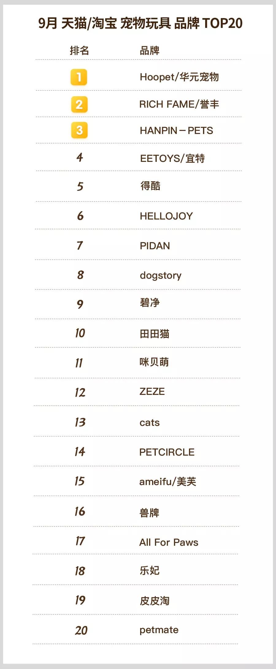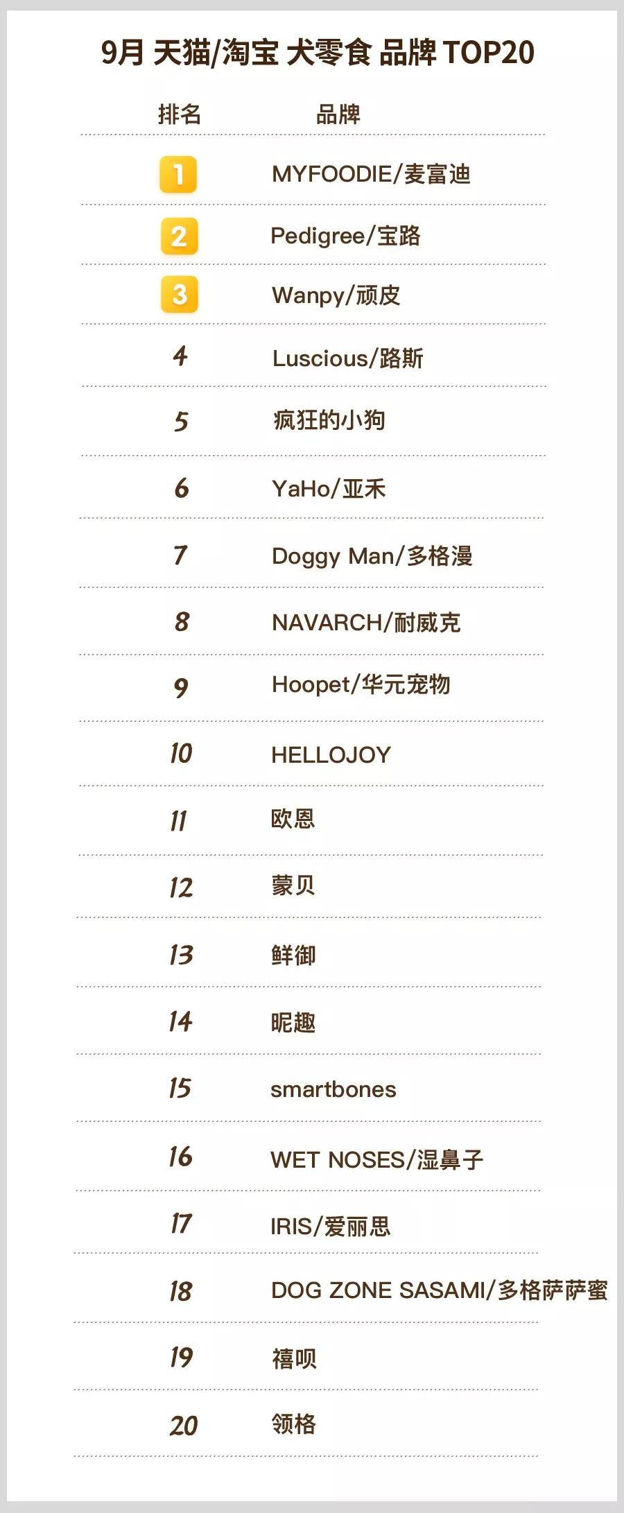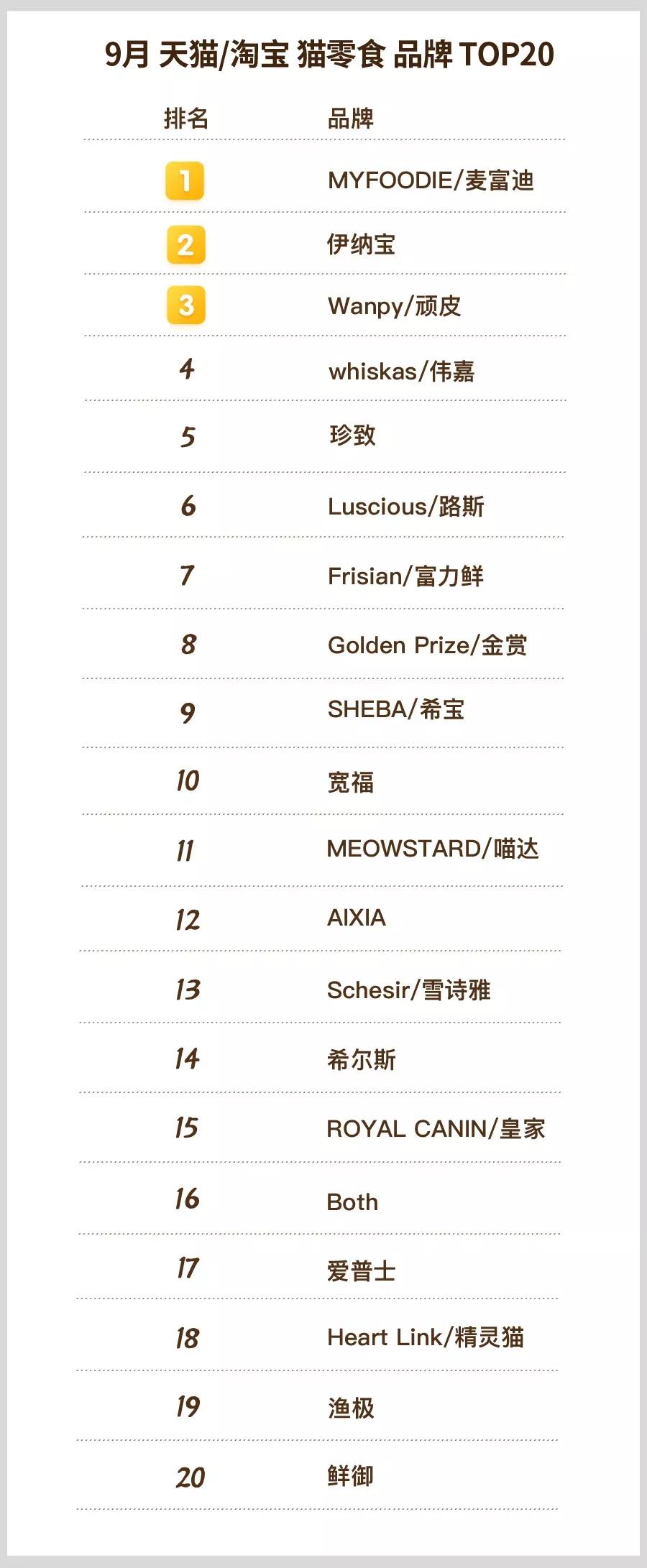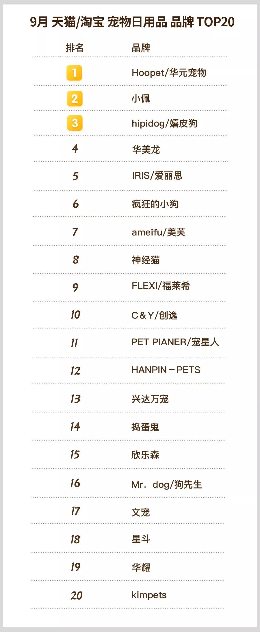 下面具體看看9月份天貓/淘寶【寵物食品、用品】領(lǐng)域TOP20榜單的上榜情況。
