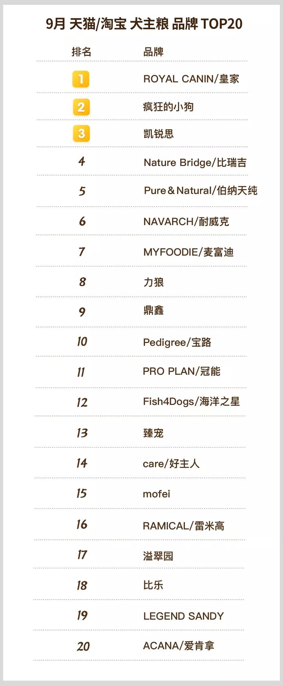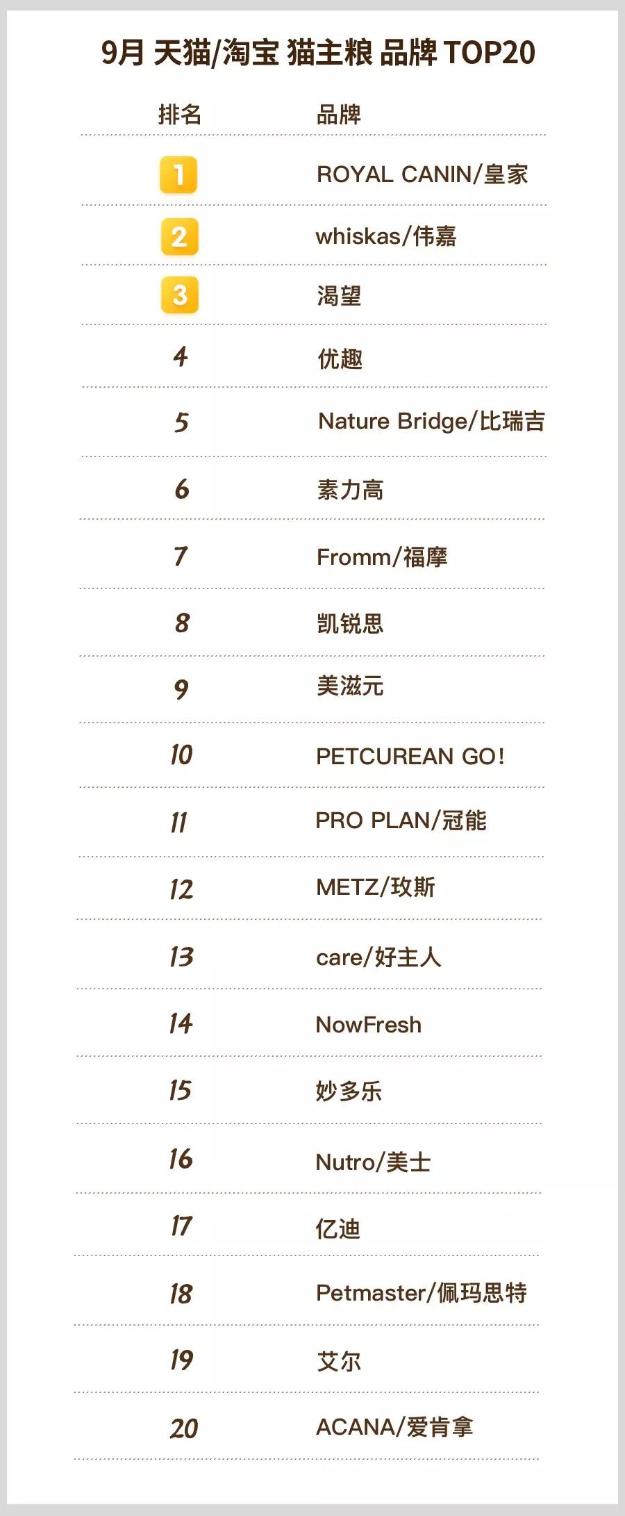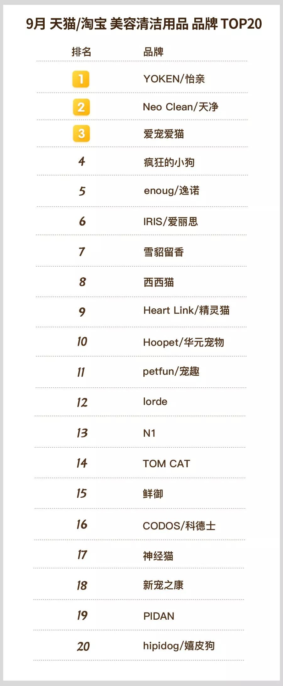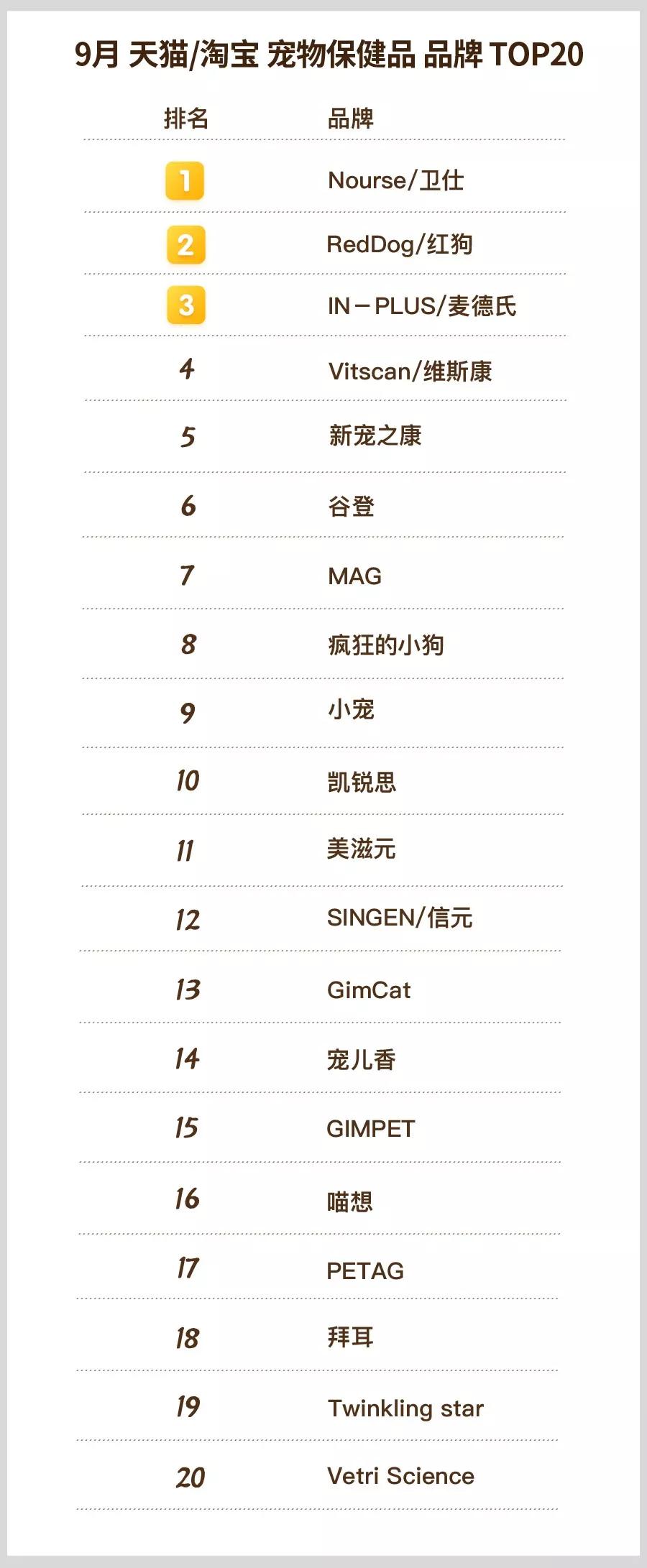 下面具體看看9月份天貓/淘寶【寵物食品、用品】領(lǐng)域TOP20榜單的上榜情況。