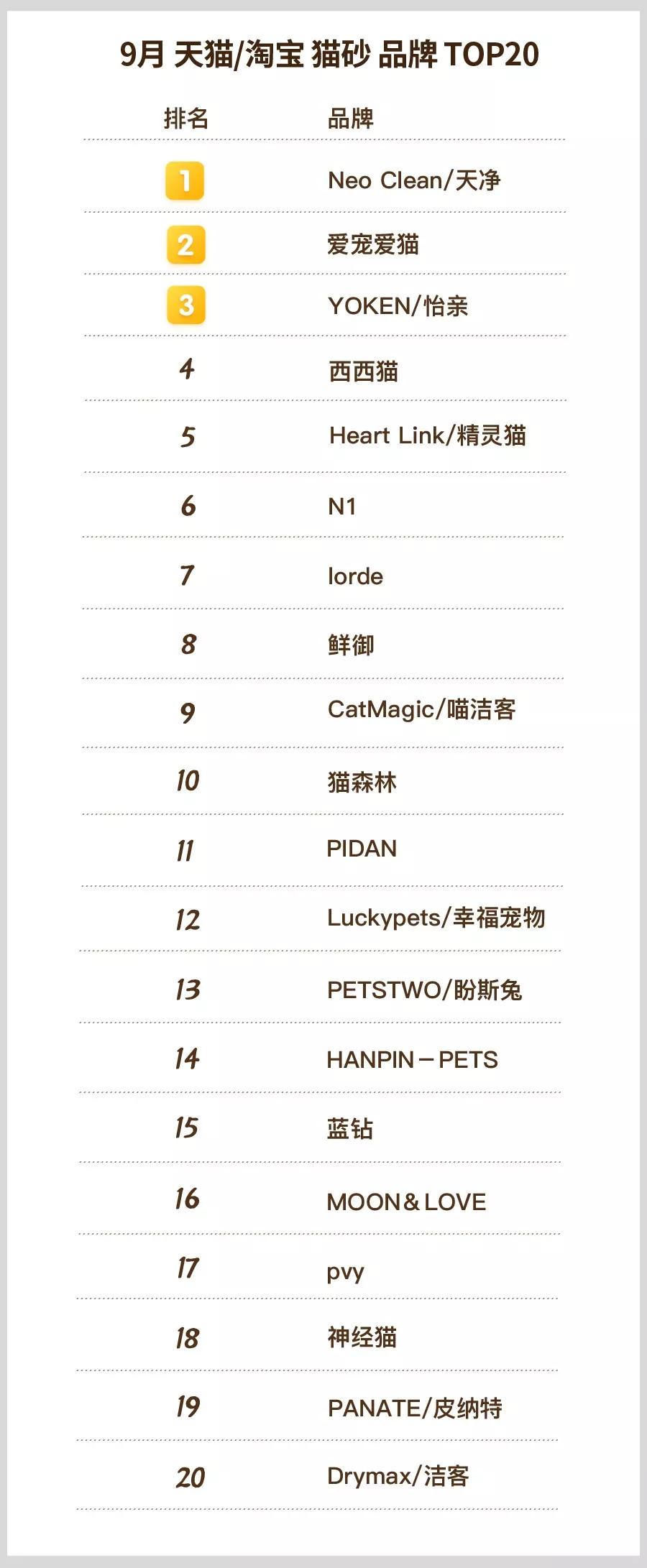 9月貓砂榜表現(xiàn)極為穩(wěn)定,較8月榜單前五名的品牌排名均未出現(xiàn)任何變化,N1上升1名排名第六;Lorde較8月下滑1名,位居榜單第七;CatMagic/喵潔客連續(xù)上升4名,擠進(jìn)榜單前十位居第十;pvy連續(xù)上升10名榮登榜單位居第十七;HANPIN-PETS、MOON&LOVE、神經(jīng)貓、Drymax/潔客則表現(xiàn)相反,均出現(xiàn)下滑現(xiàn)象。
