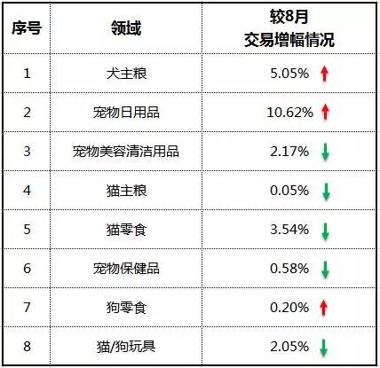 從交易增長幅度上來看,9月寵物日用品領(lǐng)域交易增漲幅度最高,增長10.62%;接下來是犬主糧,增長5.05%;犬零食增長0.20%。8月全品類增幅最高的貓主糧9月出現(xiàn)了交易減少趨勢。