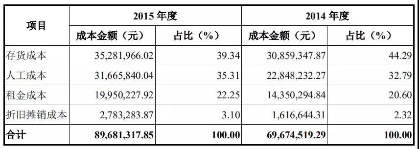 下圖為瑞鵬2014-15年度公司營業(yè)成本的具體情況(之后的年度財報均未公布):