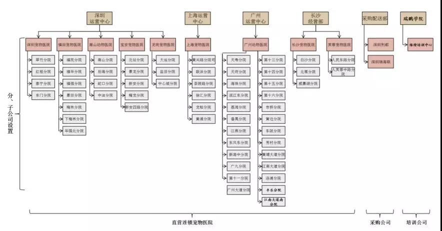 從左到右:采用“直營連鎖寵物醫(yī)院+采購公司+培訓公司”的組織結構