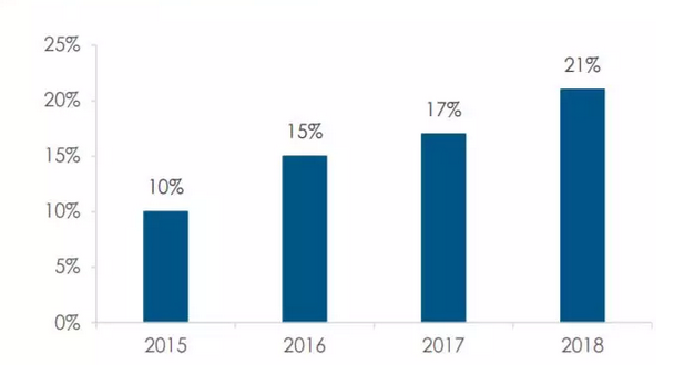 2015~2018年中國家庭養(yǎng)寵比例從10%提高到21%,歐美發(fā)達國家的家庭養(yǎng)寵比例基本都在50%以上。目前國內(nèi)寵物主糧市場的競爭格局仍以品牌競爭為主,外資品牌占據(jù)主導地位。在競爭激烈的主糧市場,優(yōu)秀的國產(chǎn)品牌已經(jīng)通過電商渠道實現(xiàn)突圍,并已經(jīng)占據(jù)一席之地。