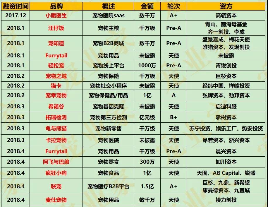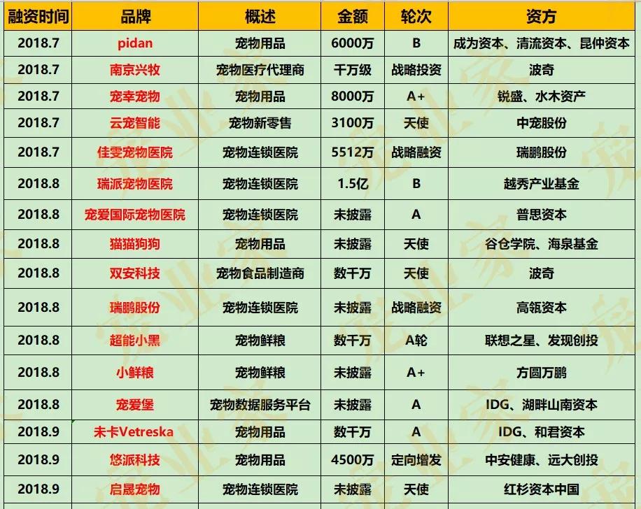 在新品類方面,軟糧領(lǐng)域玩家汪仔飯斬獲2018年第一筆公開融資,而鮮糧賽道則在下半年發(fā)力,小鮮糧、超能小黑、毛球殿下、食佳鮮寵4家主打鮮糧的寵物公司相繼拿到融資;此外,保健品領(lǐng)域的衛(wèi)仕母公司寵幸寵物前后拿到1.8億元的融資;