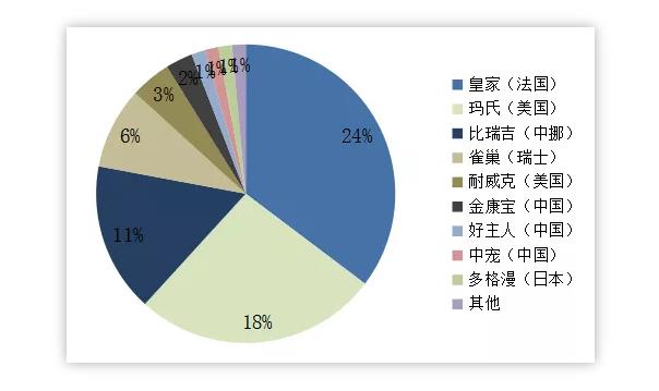 國內(nèi)寵物食品市場上品牌眾多,但整體還是以國際品牌為主導(dǎo),根據(jù)中信建投的數(shù)據(jù),2017年,法國皇家品牌市場占有率為24%,高居榜首;而美國瑪氏則以18%的份額排第二