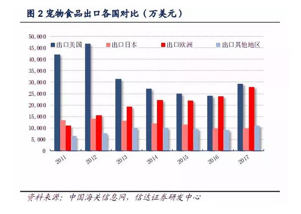 但海外市場近年來波動很大,增速疲軟。2010至2012年間出口規(guī)模增長較快,2013至2015年呈下降趨勢,2016年至2017年企穩(wěn)回升,2017年度實現(xiàn)出口額為7.8億美元(折合人民幣約55億元)。我國寵物食品出口規(guī)模自2013年開始出現(xiàn)下降主要受美國的寵物食品安全事件和日本寵物食品市場增長乏力的影響所致;2017年較2016年呈現(xiàn)較大幅度提升主要受益于中國產(chǎn)寵物食品在美國市場認可度回升及歐洲寵物食品市場的持續(xù)向好。