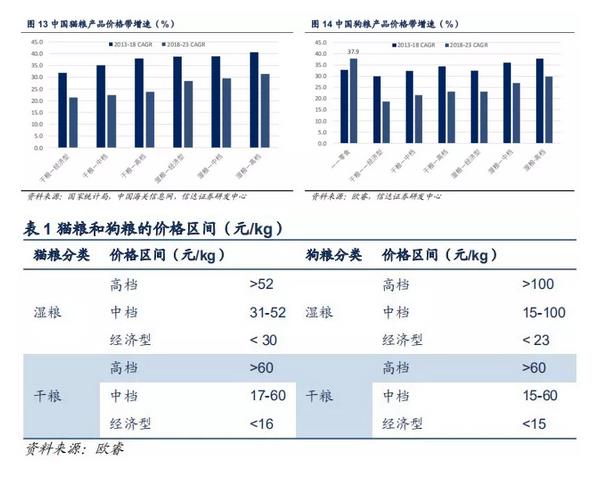 2013-18年間,我國貓糧總體增速略高于狗糧??v向比較各產(chǎn)品價格帶,可以很明顯的看到我國寵物食品正經(jīng)歷消費升級的趨勢:不論是貓糧還是狗糧,高檔產(chǎn)品CAGR增速明顯快于經(jīng)濟型和中檔產(chǎn)品。值得注意的是寵物零食,2018-23年的預期CAGR增速仍高于前5年,體現(xiàn)了極強的增速。