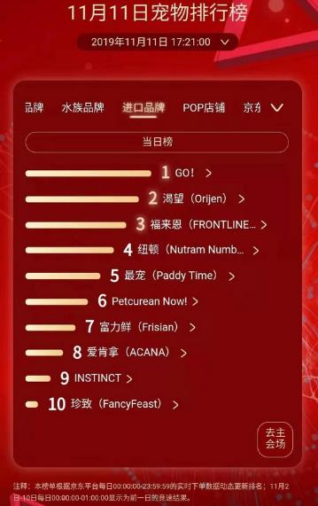 在最新的進(jìn)口品牌榜單中,排行前十的分別為GO!、渴望、福來恩、紐頓、最終、Petcurean Now!、富力鮮、愛肯拿、INSTINCT以及珍致。