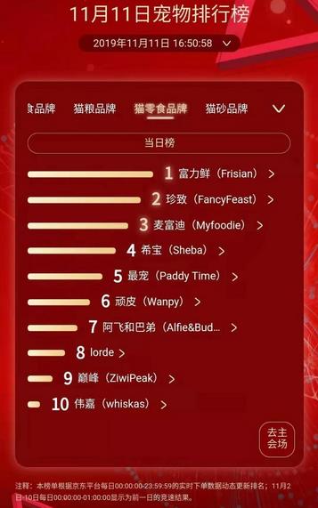 與11月1日相比,富力鮮已超過巔峰排行第一名,前三名品牌分別為:富力鮮、珍致以及麥富迪。新晉上榜品牌包括麥富迪以及阿飛和巴弟。