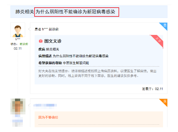 2月11日曾有網(wǎng)友在好大夫平臺提問,“為什么弱陽性不能確診為新冠病毒”;