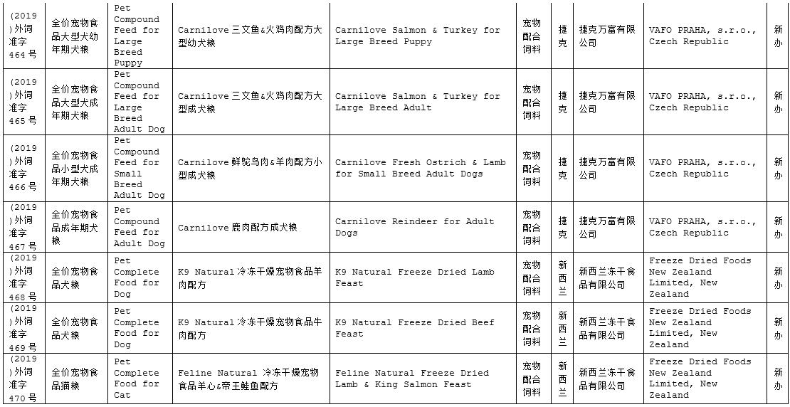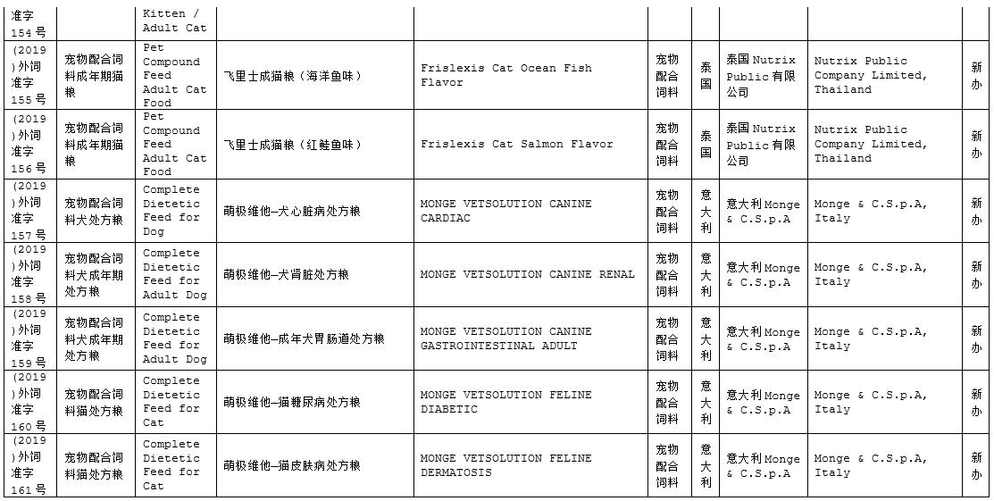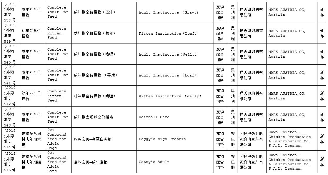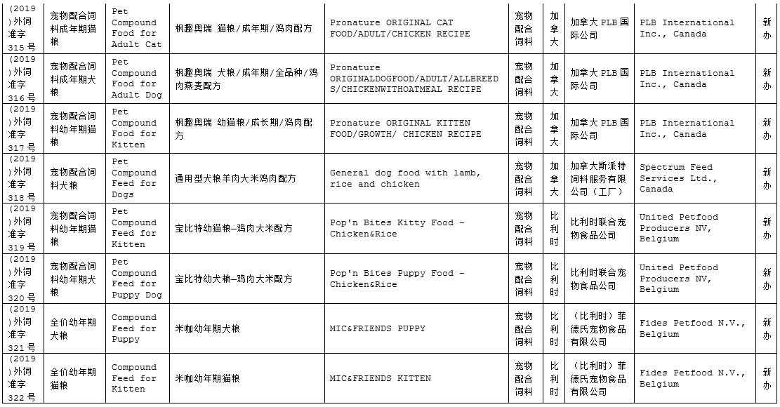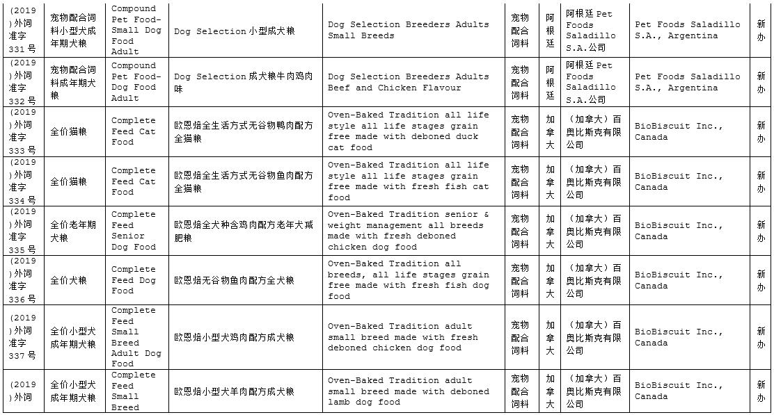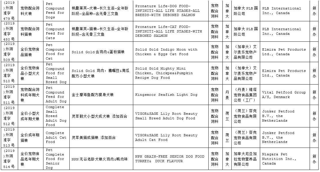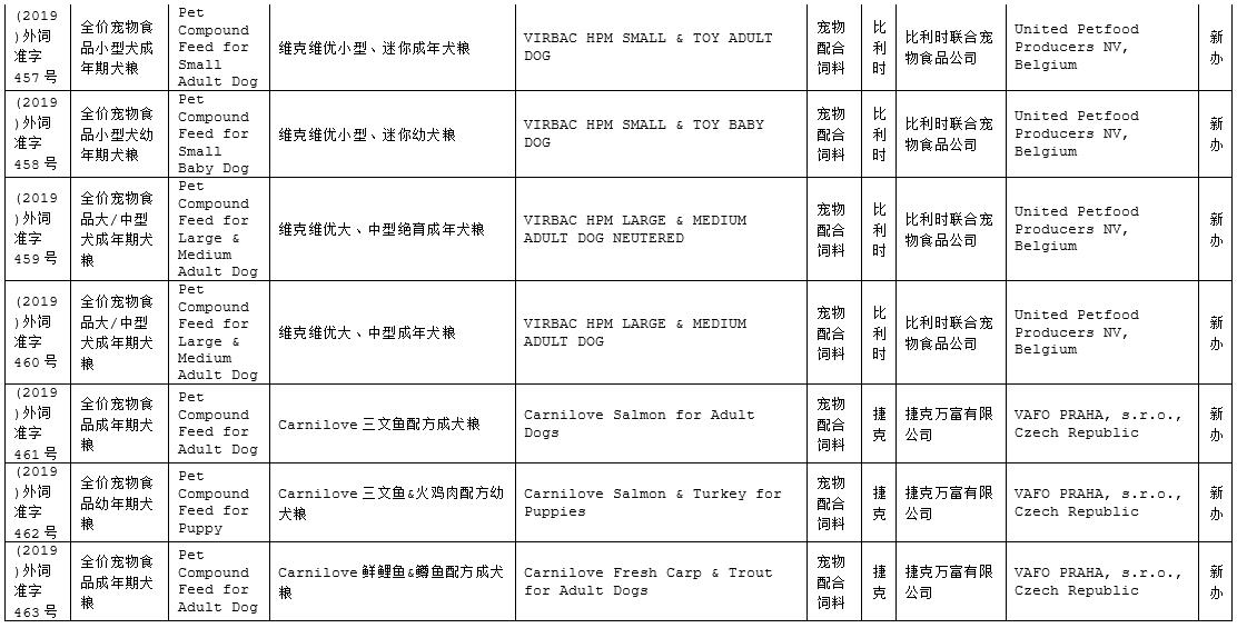 2019年 進(jìn)口寵物食品在我國新辦或續(xù)展獲證情況,如下: