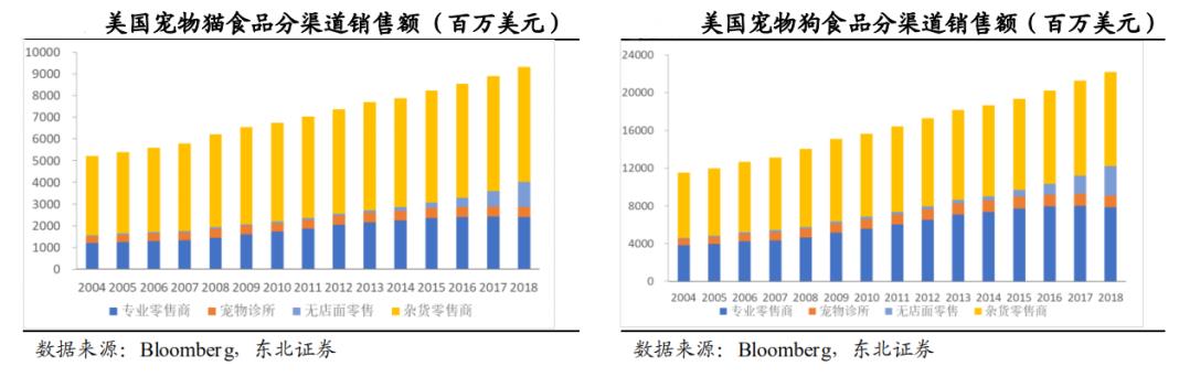 區(qū)別于這些發(fā)達(dá)國(guó)家,中韓等國(guó)寵物食品市場(chǎng)正處于高速發(fā)展時(shí)期,消費(fèi)習(xí)慣的改變,消費(fèi)能力的提升、新消費(fèi)觀念的樹(shù)立和寵物地位的提升,讓寵物主更愿意為寵物買單,面對(duì)強(qiáng)大的市場(chǎng)缺口,專業(yè)渠道、一般零售渠道并不能完全填補(bǔ),電商渠道成為寵物食品銷售額上漲主要渠道。低成本、高效率的電商渠道在中韓這樣的新興寵物市場(chǎng)有著得天獨(dú)厚的優(yōu)勢(shì)。以中國(guó)為例,2009-2018年寵物食品電商渠道占比由0.3%迅速躍升至45.4%,并于2017年超過(guò)專營(yíng)店成為寵食銷售第一大渠道;電商渠道寵物食品銷售增速驚人,遠(yuǎn)超其他渠道。