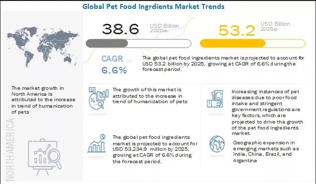 根據(jù)MarketsandMarkets™獨(dú)家報(bào)告,到2025年,全球寵物食品配料市場(chǎng)規(guī)模預(yù)計(jì)將達(dá)到532億美元。其中2020年這一市場(chǎng)估計(jì)達(dá)到386億美元的規(guī)模,未來(lái)將以6.6%的復(fù)合年增長(zhǎng)率增長(zhǎng)。