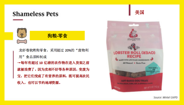 在美國(guó),“Shameless Pet” 推出了一系列使用了被市場(chǎng)淘汰的食物制成的狗糧(如部分農(nóng)作物成熟后因?yàn)橘u相不好等不影響質(zhì)量的原因而無緣貨架,造成了大量的浪費(fèi))。還有從來自蘋果汁廠的蘋果肉渣,來自罐頭工廠的龍蝦殼,“Shameless Pet”稱其產(chǎn)品中高達(dá)40%的成分來自于“回收再利用”的升級(jí)原料。這樣既滿足了寵物的營(yíng)養(yǎng)需求,也避免了資源浪費(fèi),還能幫助農(nóng)民增加收入。