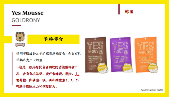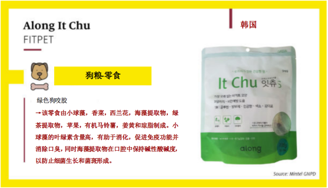 在韓國(guó),Goldrony品牌推出了一系列適用于微波爐的慕斯?fàn)罟妨闶场C恳豢钅剿苟际怯?strong>有機(jī)羊奶和麥盧卡蜂蜜配制而成,并精選了超級(jí)食品成分,宣稱其功能性。再例如狗咬膠,來自韓國(guó)品牌Along It Chu使用了小球藻。據(jù)說這種成分富含葉綠素,有助于消化,增強(qiáng)免疫功能,并能消除口腔異味。