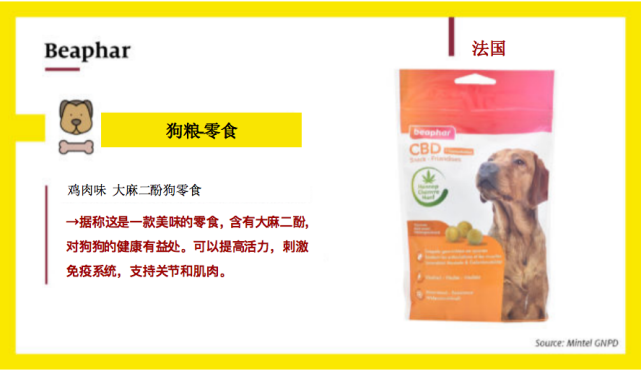 排第一位的是“護(hù)膚&美毛”,占所有上新數(shù)量的14%,其次是“消化健康”,“潔牙&護(hù)齒” ,“增強(qiáng)免疫力”。法國(guó)推出的Beaphar零食含有大麻二酚(CBD),被認(rèn)為對(duì)狗狗的健康有益處,可以增強(qiáng)活力,刺激免疫系統(tǒng),支持關(guān)節(jié)和肌肉。