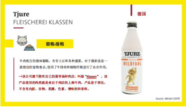 寵物主人對(duì)清潔標(biāo)簽的期望已經(jīng)從“安全”和“天然”演變?yōu)橐螳@得原料來源和加工信息。如下圖的案例,德國(guó)品牌Tjure,推出了和本土知名肉店合作的貓糧產(chǎn)品,宣稱產(chǎn)品的牛肉是來自于知名肉店“KLASSEN”里供應(yīng)的牛排,有效得到了人類食品供應(yīng)商的背書。另外還有英國(guó)Hownd Hemp推出的大麻二酚狗零食,不僅宣稱大麻是產(chǎn)品里的油脂和蛋白質(zhì)的單一來源,而且產(chǎn)品包裝是用有機(jī)大麻制成,天然又環(huán)保。