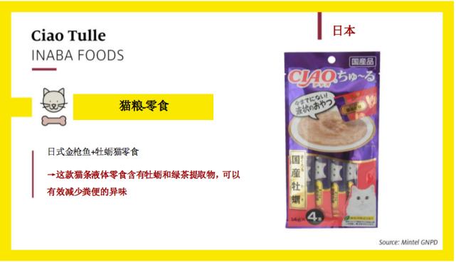 在亞太地區(qū),年輕的寵物主人正在尋找能代表自身態(tài)度、生活方式的寵物食品。因此,各大品牌都在不斷創(chuàng)新產(chǎn)品口味和成分,以幫助寵物達(dá)到理想狀態(tài)。寵物食品和護(hù)理產(chǎn)品受到人類市場(chǎng)的啟發(fā)變得越來越高端化。例如,Ciao Tulle 新出的日式金槍魚 &牡蠣貓零食 (下圖)是在日本推出的一款美味的液體貓糧,含有牡蠣和綠茶提取物,適合與干貓糧混合使用。