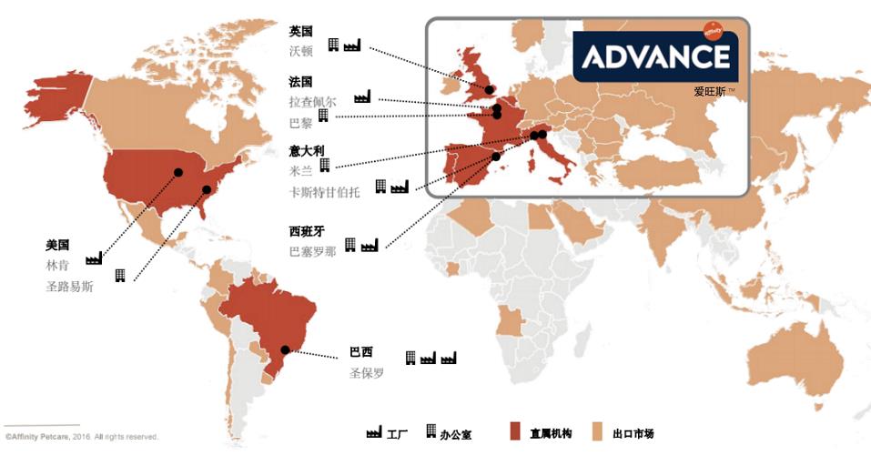 據(jù)官方內(nèi)部人士介紹,西班牙ADVANCE愛旺斯品牌背后母公司的來頭不小,其屬于西班牙阿菲利蒂寵物養(yǎng)護公司(Affinity Petcare S.A.),一家擁有超過55年動物食品制造經(jīng)驗的全球性公司,于1963年創(chuàng)立,最早從事動物食品的研發(fā)和生產(chǎn);1979年開始正式進軍寵物食品領(lǐng)域,如今已發(fā)展到全球第五大寵物食品制造商的市場地位,在全球范圍擁有超1800名雇員,業(yè)務(wù)橫跨70多個國家和地區(qū),12萬個銷售網(wǎng)點,服務(wù)1400萬個家庭用戶;ADVANCE愛旺斯及Affinity旗下其他寵物食品品牌更是取得了在西班牙占據(jù)市場份額第一、法國和意大利占據(jù)市場份額第二、巴西,美國等地區(qū)處于領(lǐng)先地位的成績。