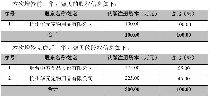 據(jù)公告內(nèi)容,本次投資前,華元德貝注冊(cè)資本為人民幣100萬元,公司與華元德貝以及華元寵物簽訂《增資協(xié)議》,約定由公司與華元寵物對(duì)華元德貝增資合計(jì)400萬元。其中,公司增資275萬元,華元寵物增資125萬元,增資完成后華元德貝注冊(cè)資本增加至人民幣500萬元,公司持股占其增資后注冊(cè)資本的55%。