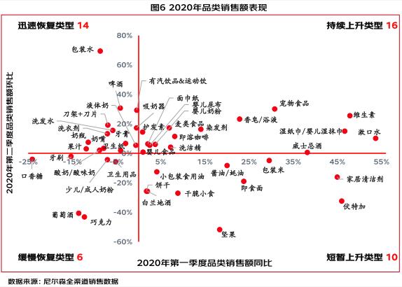 白皮書數(shù)據(jù)顯示,受疫情沖擊,中國快消品整體市場在2月下挫,自3月開始快速恢復(fù),直至6月由線上銷售驅(qū)動,實現(xiàn)了上半年最高的同比銷售增長(+7.6%)。在市場整體的標(biāo)志性回暖背后,疫情持續(xù)對細(xì)分品類的銷售產(chǎn)生了結(jié)構(gòu)性影響,也重塑了中國快消品零售的渠道格局。
