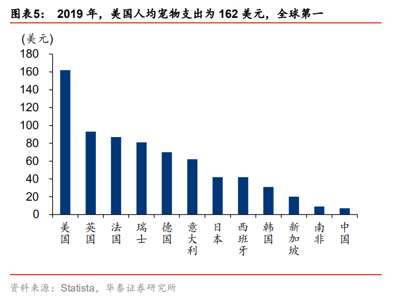 除具有規(guī)模龐大的寵物基數(shù)之外,美國的平均家庭寵物支出也高居世界首位。據(jù)Statista統(tǒng)計,2019年美國人均寵物支出為162美元,是全球唯一一個人均寵物支出高于150美元的國家,遠高于排名第二的英國(2019年人均寵物支出為93美元)。
