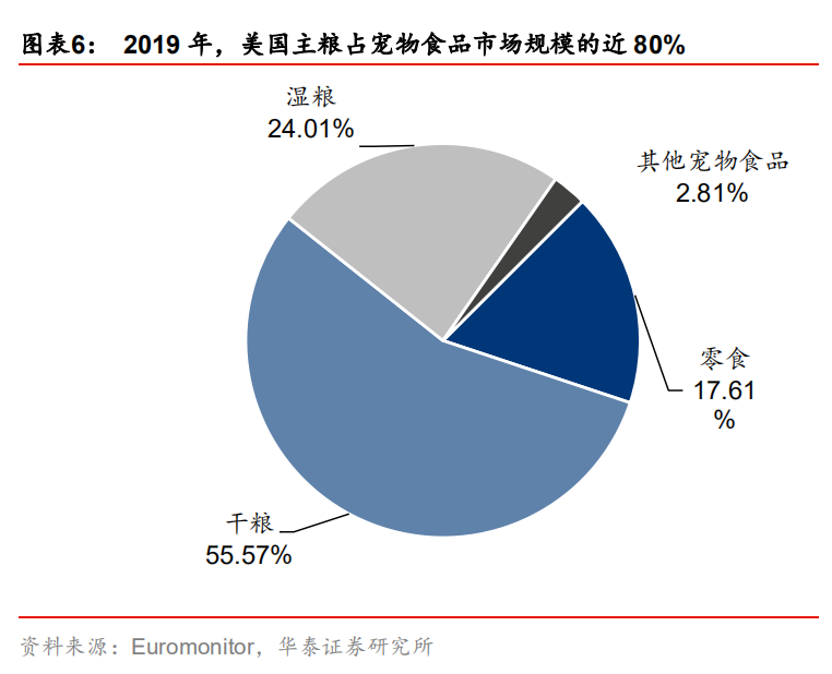 據(jù)Euromonitor統(tǒng)計,2019年美國寵物食品市場中主糧銷售總額為273.31億美元,占寵物食品市場銷售總規(guī)模的近80%。具體來看,2019年干糧銷售額為190.85億美元,占比約55.57%;濕糧銷售額為82.46億美元,占比約24.01%。