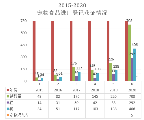 小編梳理了我國進(jìn)口寵物食品(2015-2020)期間從農(nóng)業(yè)農(nóng)村部注冊獲批證書情況,如下: