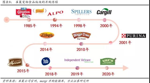 方正證券在報告中選取了七家各細分領域的海外寵企龍頭,對其各自的并購發(fā)展歷程進行了梳理。這里重點介紹瑪氏、雀巢和J.M.SMUCKER三家企業(yè),以期為國內(nèi)寵物行業(yè)的并購趨勢提供啟示。