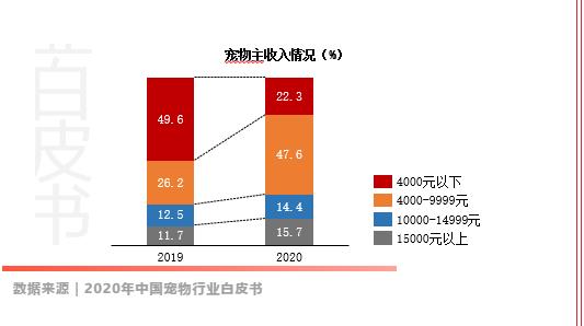 根據(jù)國(guó)家統(tǒng)計(jì)局的數(shù)據(jù),2020年城鎮(zhèn)居民人均可支配收入43834元,相當(dāng)于月均可支配收入3653元。盡管統(tǒng)計(jì)口徑不同,但二者對(duì)比也能看出,養(yǎng)寵人群的收入水平高于全國(guó)城鎮(zhèn)居民的平均收入水平。