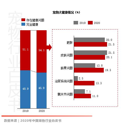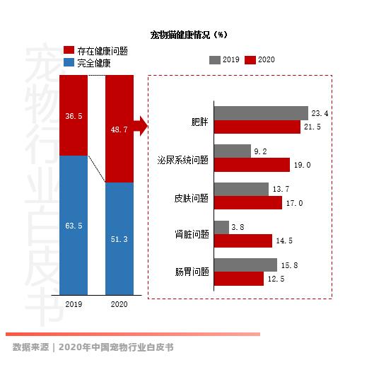 隨著年齡增長(zhǎng),寵物的健康狀況不可避免的會(huì)變差。這在《2020年中國(guó)寵物行業(yè)白皮書》中已經(jīng)能看出趨勢(shì)。和2019年相比,存在健康問題的寵物犬占比增加3個(gè)百分點(diǎn),達(dá)到54.1%,存在健康問題的寵物貓占比增加超過(guò)10個(gè)百分點(diǎn),達(dá)到48.7%。