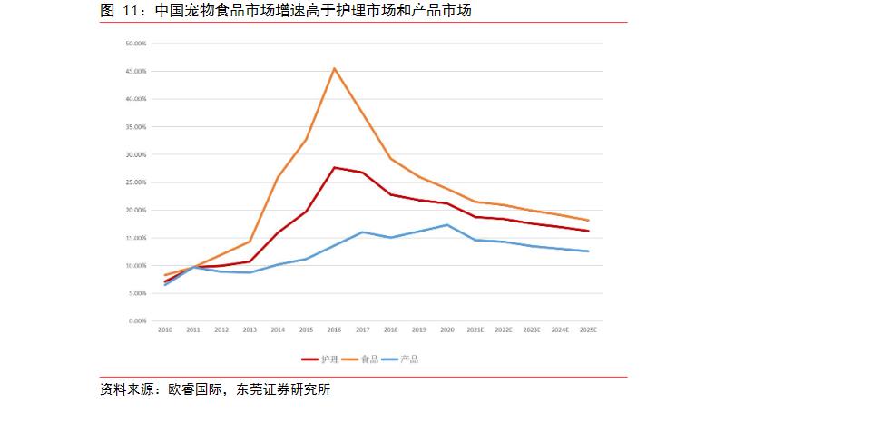 中國(guó)寵物行業(yè)2010年后進(jìn)入了高速發(fā)展期,市場(chǎng)規(guī)模顯著提速。根據(jù)歐睿國(guó)際,從2010年至2020年,中國(guó)寵物護(hù)理市場(chǎng)規(guī)模從20.65億美元上升到111.90億美元,CAGR為18.41%;同期美國(guó)寵物護(hù)理市場(chǎng)規(guī)模從351.29億美元上升到567.73億美元,CAGR為4.92%;處于高速增長(zhǎng)期的中國(guó)市場(chǎng)發(fā)展速度顯著高于成熟期的美國(guó)市場(chǎng)。歐睿預(yù)測(cè)從2021年至2025年,中國(guó)寵物護(hù)理市場(chǎng)規(guī)模從132.83億美元上升到250.99億美元,CAGR為17.24%,仍然屬于高速增長(zhǎng)的市場(chǎng)。